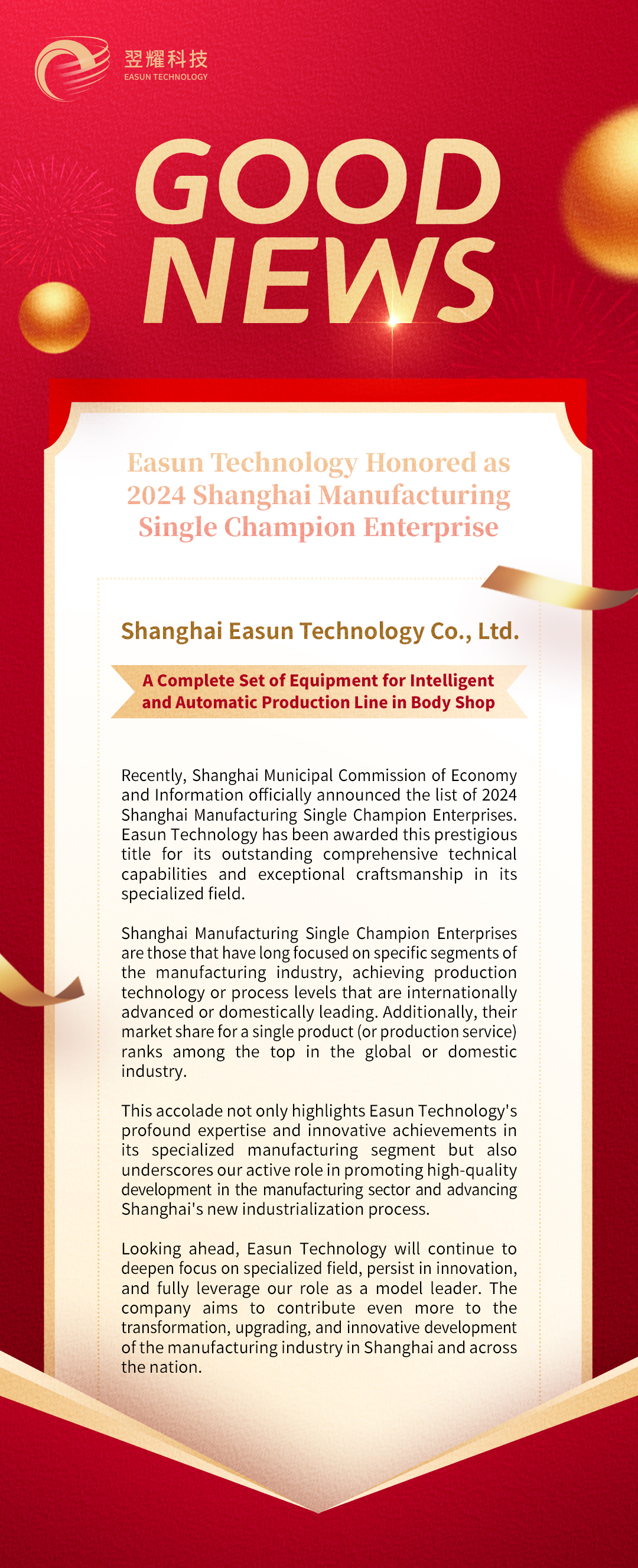 Easun Technology Honored as 2024 Shanghai Manufacturing Single Champion Enterprise